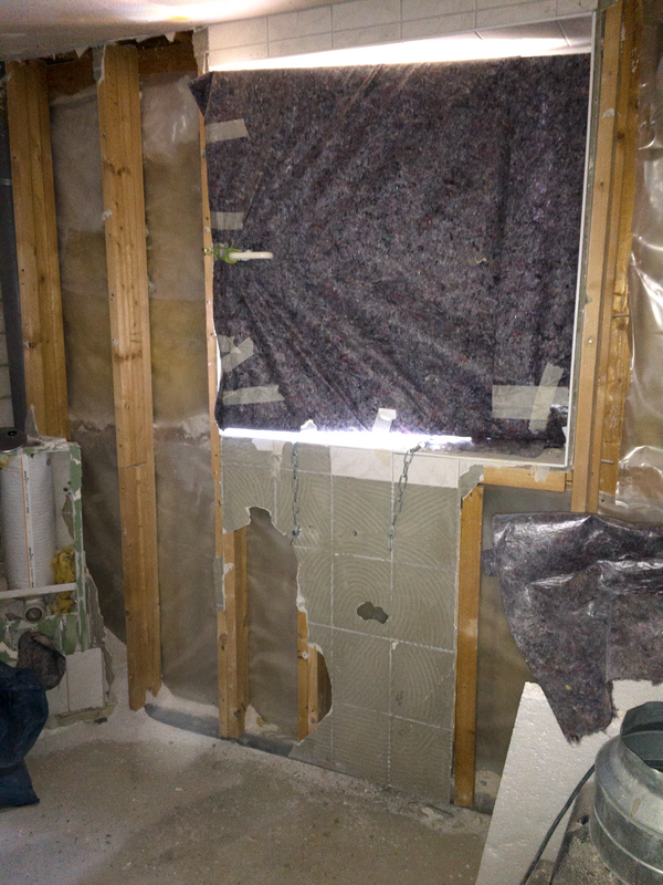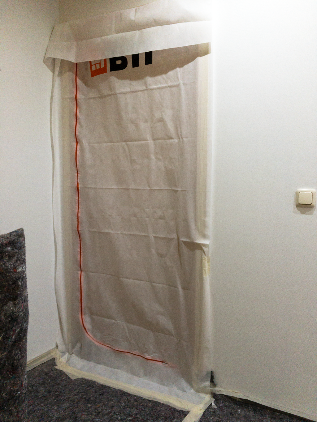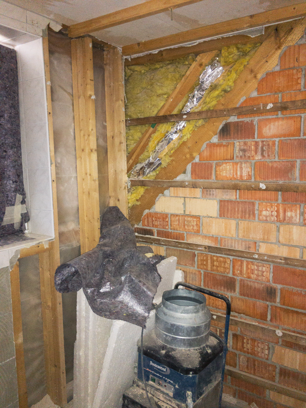 Zum Schutz des offenen Wohnbereiches im Erdgeschoss haben wir für das Badezimmer im 1. Obergeschoss eine Staubschutzwand mit Staubschutztür errichtet. Dadurch wird die Verschmutzung der restlichen Wohnräume auf ein Minimum reduziert. Die sich auf dem Laufweg befindenden Türen, Bodenbeläge und Treppen wurden mit Maler-vlies abgedeckt. Zur besseren Entsorgung des Bauschutts wurde eine Schuttrutsche montiert. Mit ihr musste der Bauschutt nicht durch das Haus getragen werden.