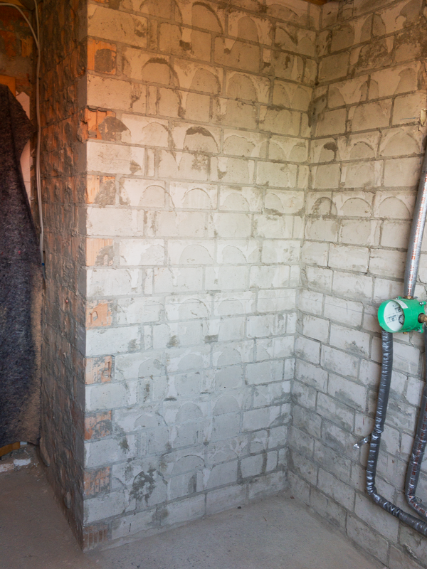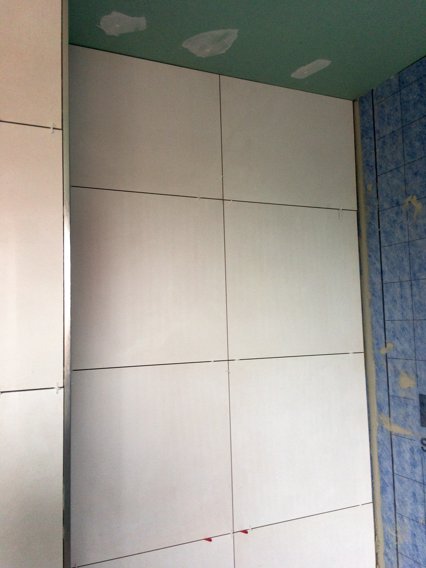 Bevor wir die Abdichtung in der Dusche installiert haben, mauerten wir einen Sitz in die Dusche. Um die Schädigung der Bausubstanz durch eindringende Feuchtigkeit zu verhindern, wurde eine Abdichtung im Duschbereich angebracht. Im Anschluss folgten die Fliesenarbeiten im Duschbereich. Mit einem Fliesenformat von 40 cm x 80 cm wurden die ersten Fliesen in der Dusche verlegt. Durch die großen, kalibrierten Fliesen entsteht eine sehr schmale Fuge.