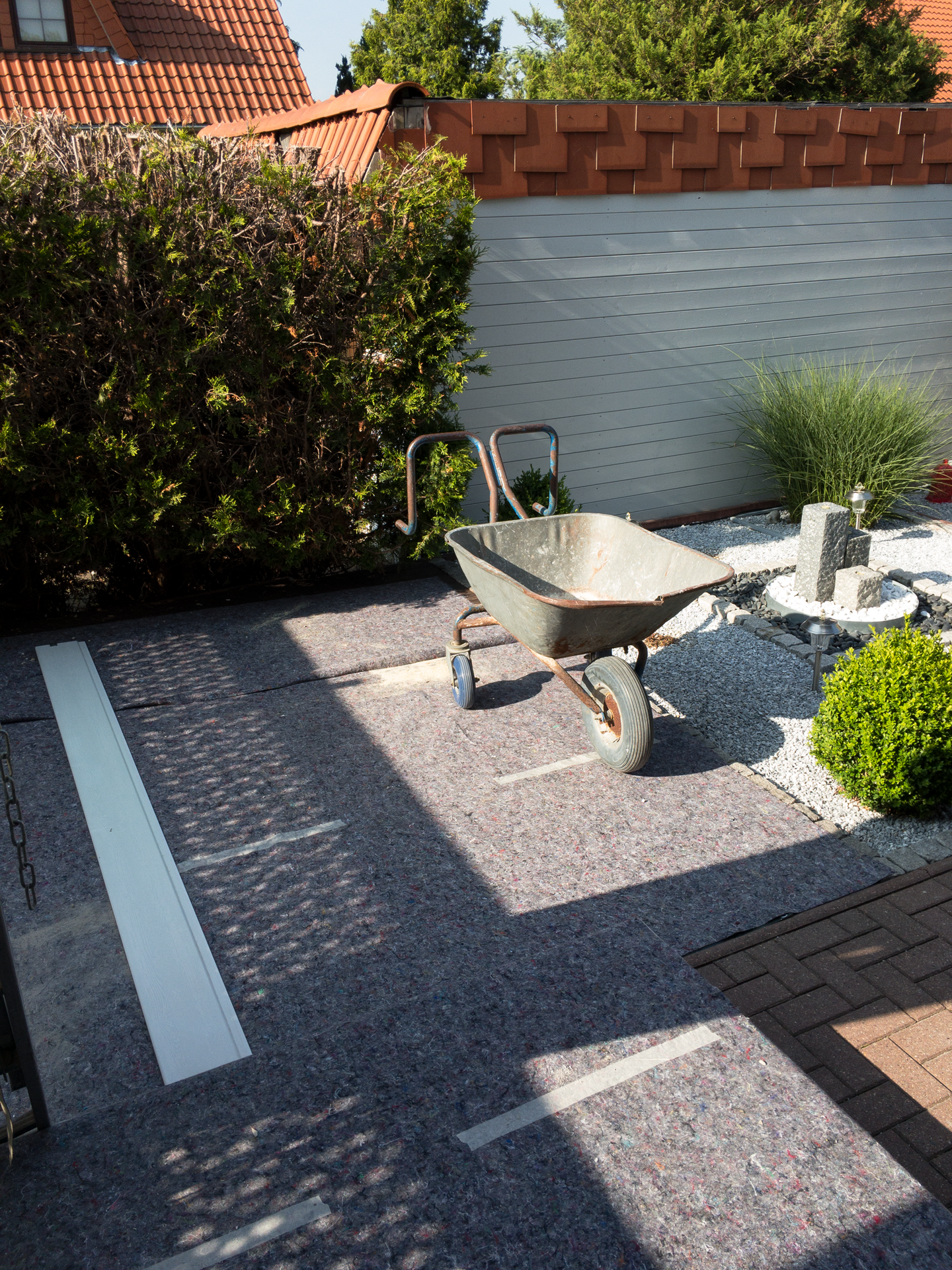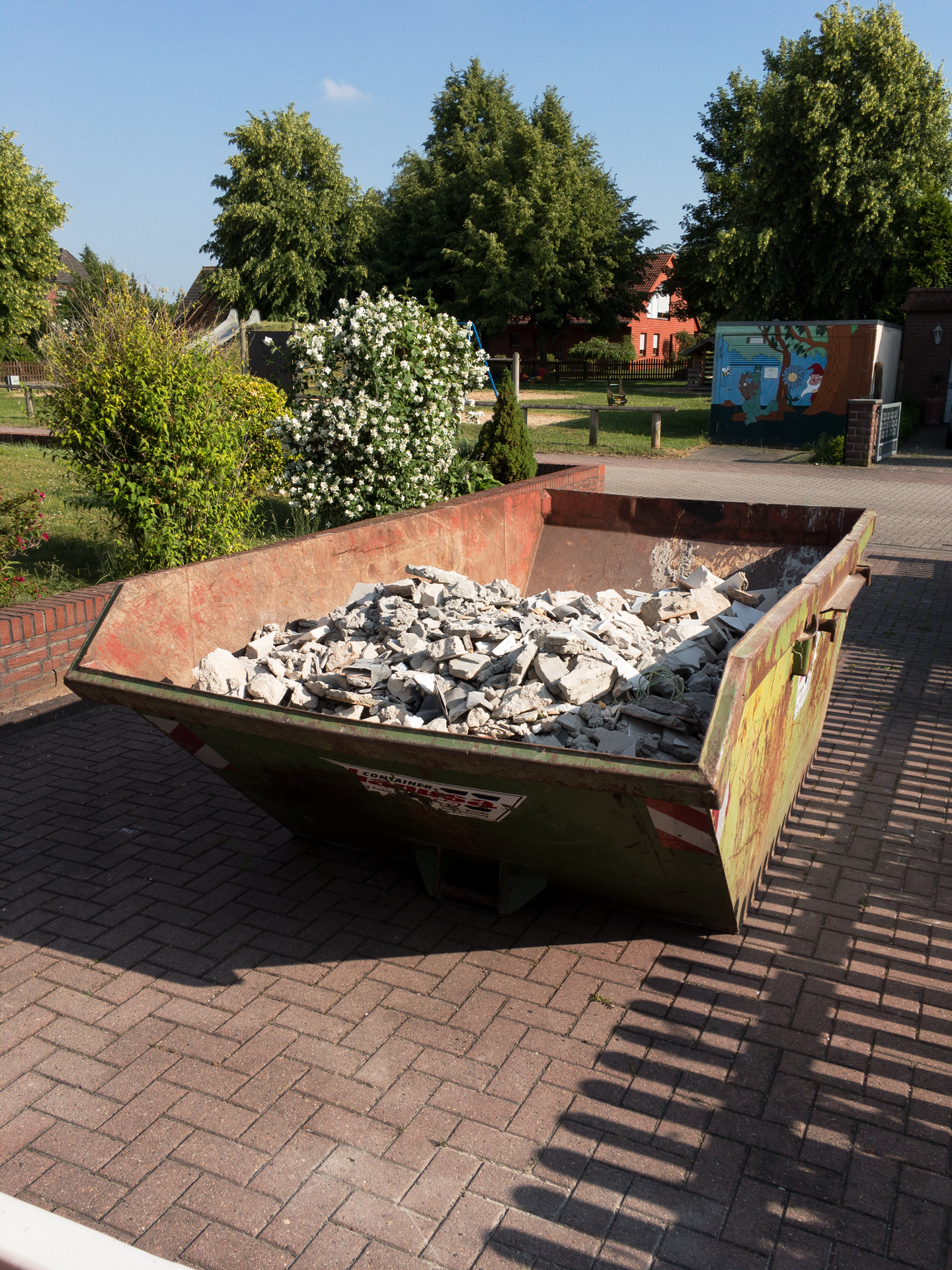 Zusätzlich wurde die Baustelle sorgfältig organisiert und strukturiert eingerichtet, um einen reibungslosen Ablauf der Arbeiten zu gewährleisten. Im Außenbereich wurde ein Container für die fachgerechte Entsorgung des Abbruchmaterials bereitgestellt. Werkzeuge und Materialien wurden zentral auf einer geschützten Fläche gelagert, sodass jederzeit ein schneller Zugriff möglich war, ohne die Wohnbereiche zu beeinträchtigen.