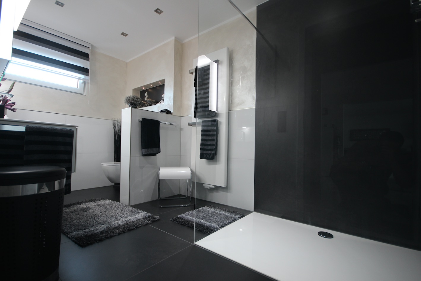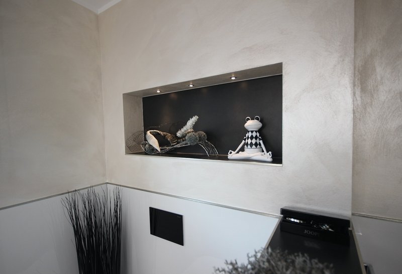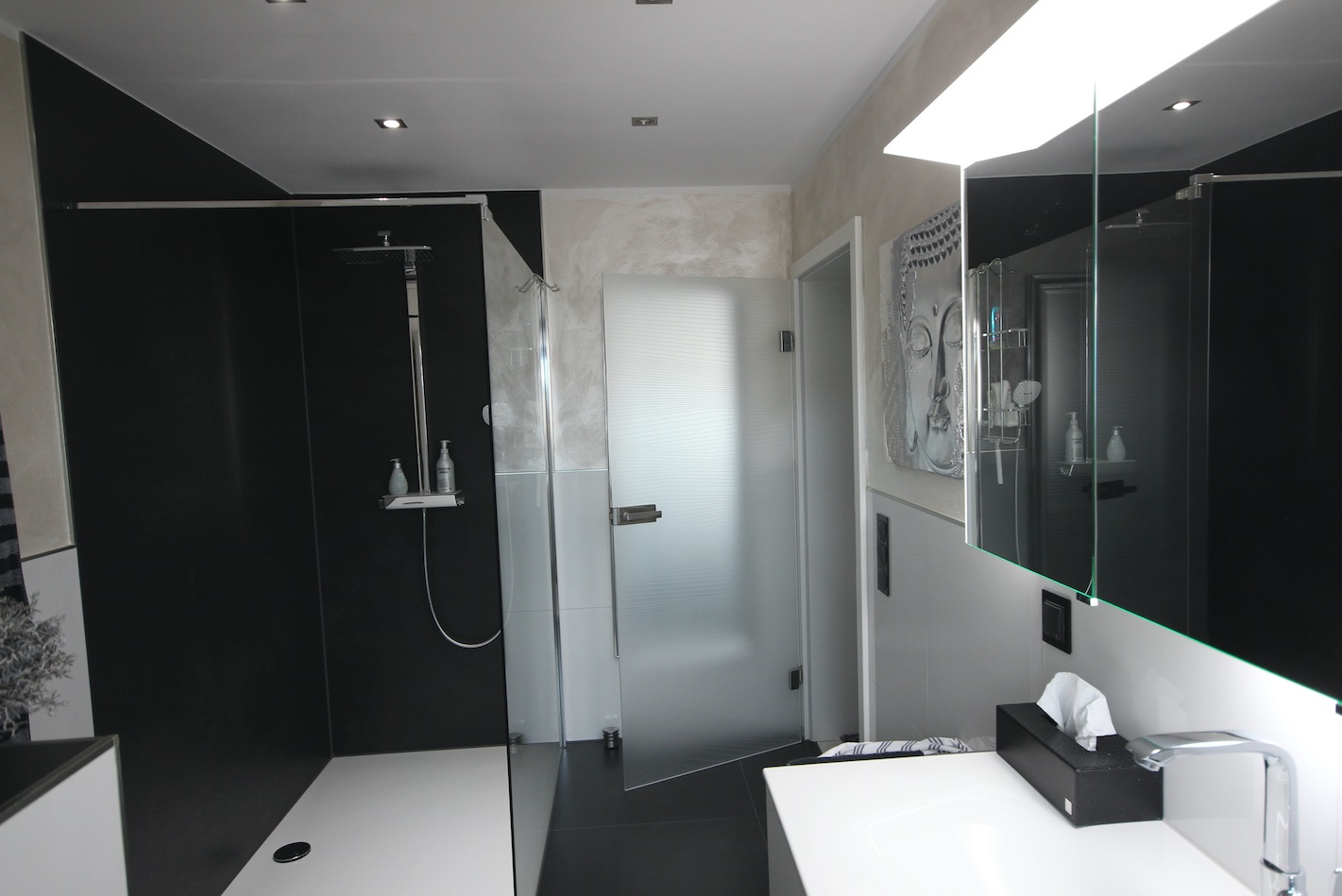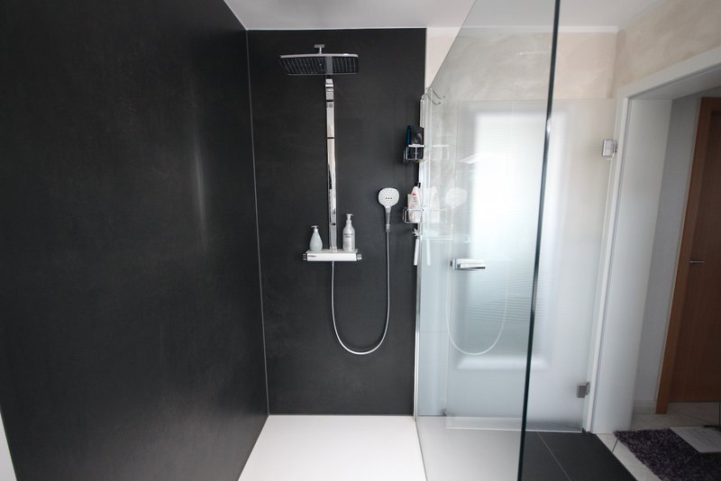 Im Haus der Familie wurde das Badezimmer komplett neu gestaltet. Großen Wert legten Vestes dabei auf eine fugenlose Dusche. Hierfür setzte Knöfler spezielle Fliesen aus Italien ein, deren Anlieferung ein Kraftakt war. „Ich habe nicht gedacht, das die immens großen Fliesen heil ins Bad kommen“, lacht Angelika Veste, „aber es hat alles geklappt.“ Zudem wurde ein metallischer Putz verwendet, der je nach Lichteinfall verschiedene Schattierungen zeigt.