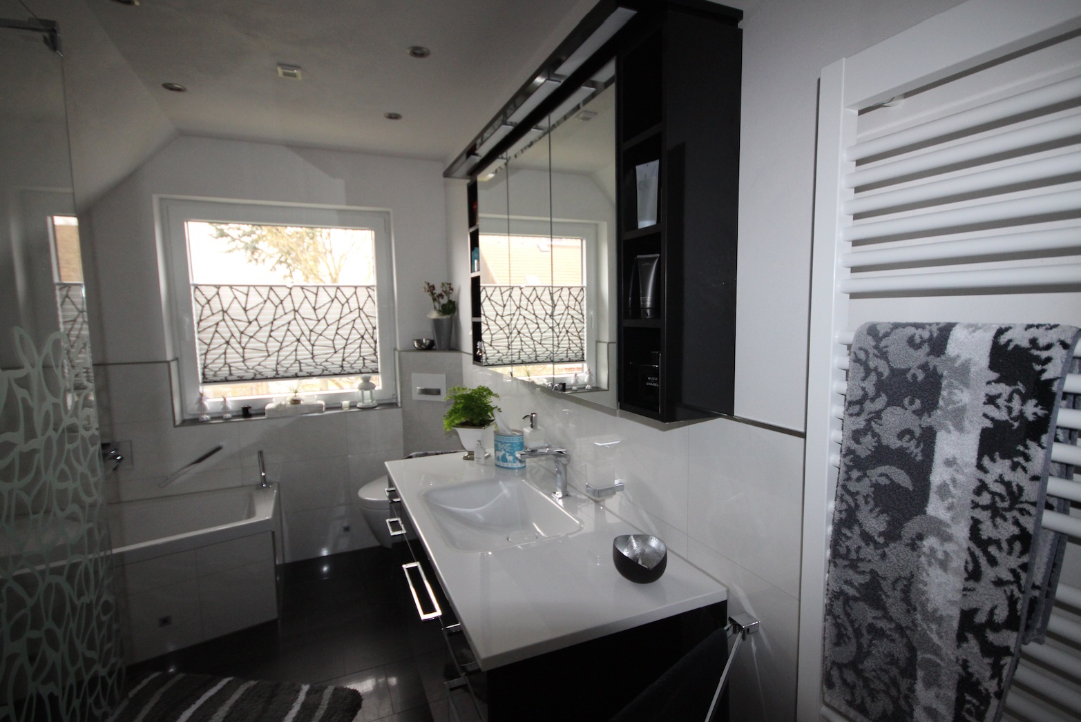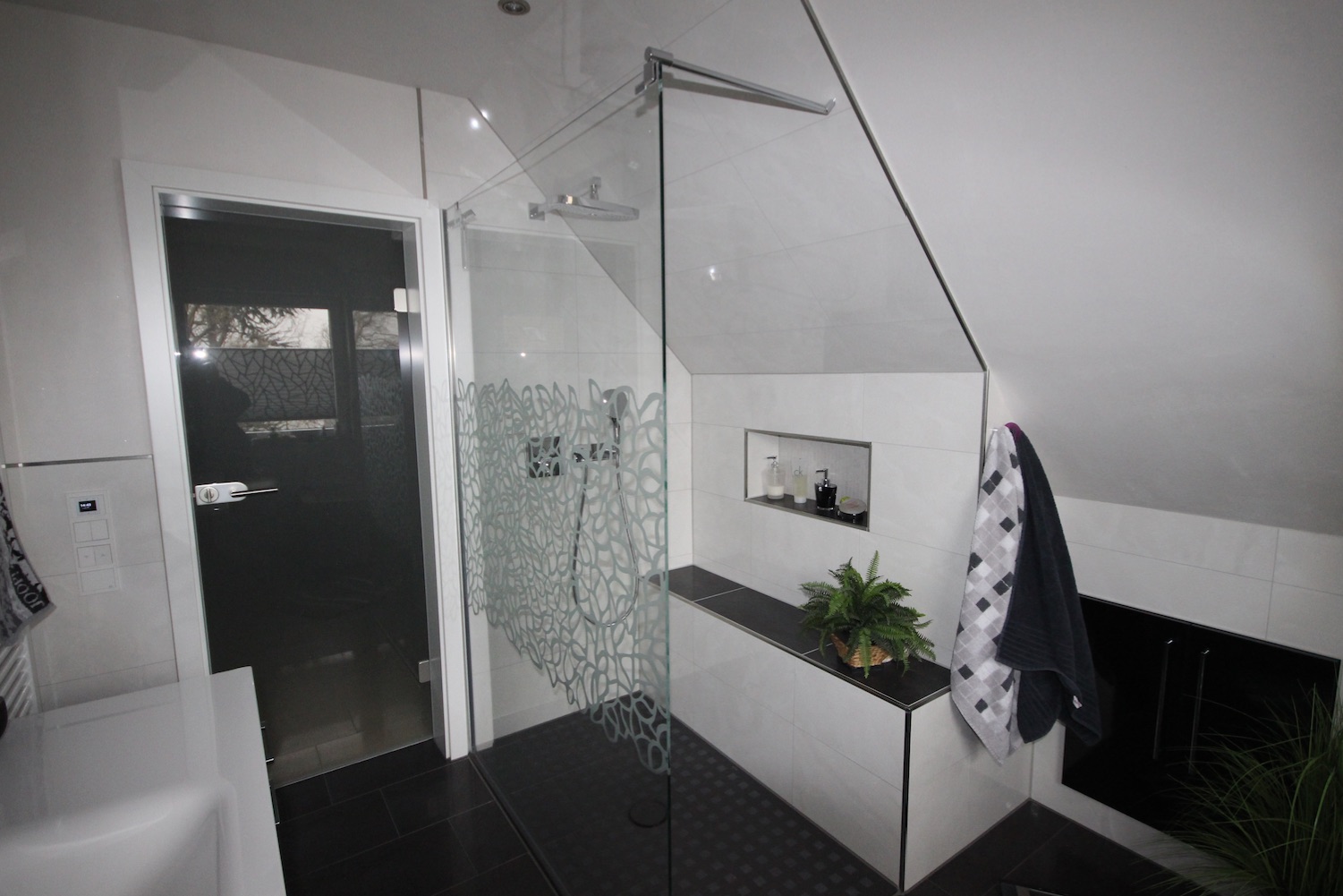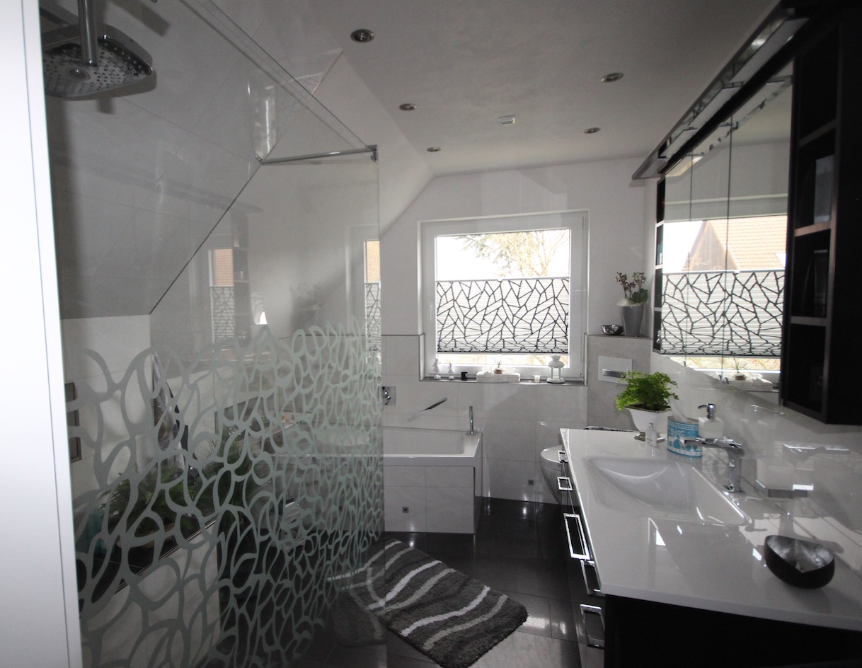 Die Sitzgelegenheit und Ablagefläche in der frei begehbaren Dusche, schaffte zusätzliche Bewegungsfreiheit. Das sandgestrahlte Dekor der Duschabtrennung wird zum „Eyecatcher“ im Badezimmer.