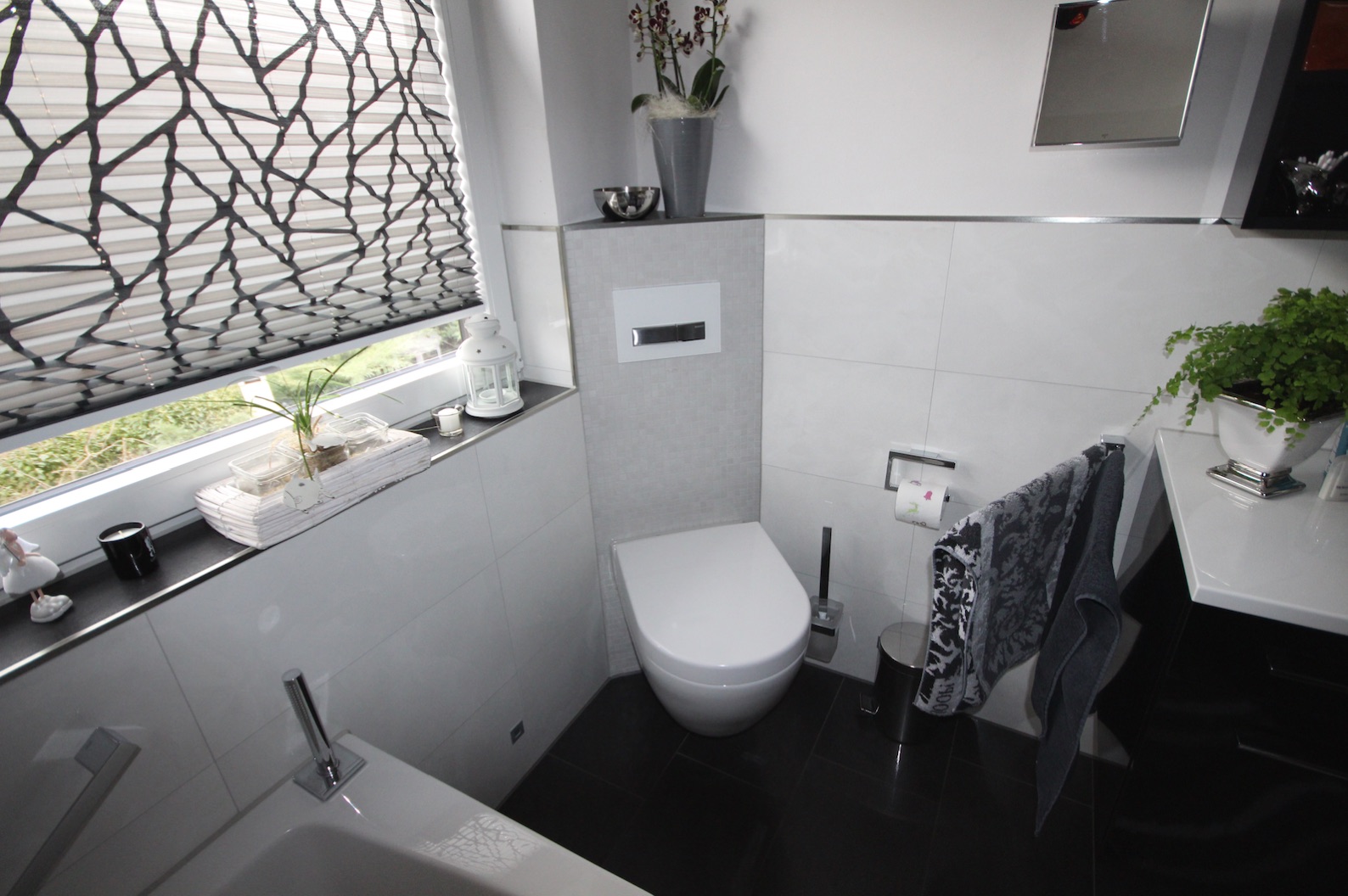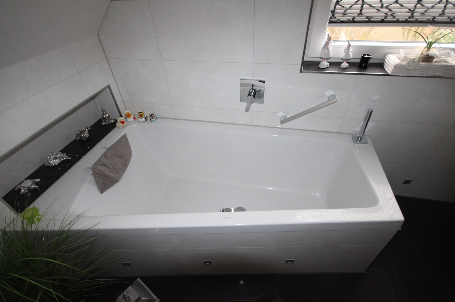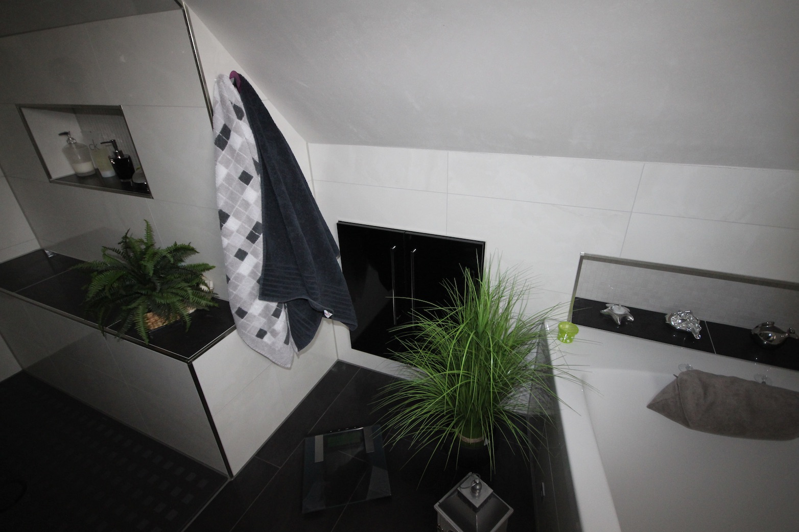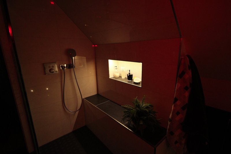 Charakteristisch für das realisierte Bad ist der pflegeleichte und langlebige Kalkmarmorputz an den Wänden, Schräge und Decke im Kontrast zum dunkel gefliesten Fußboden. Das Raumerleben wird durch ein individuelles Lichtkonzept unterstützt.