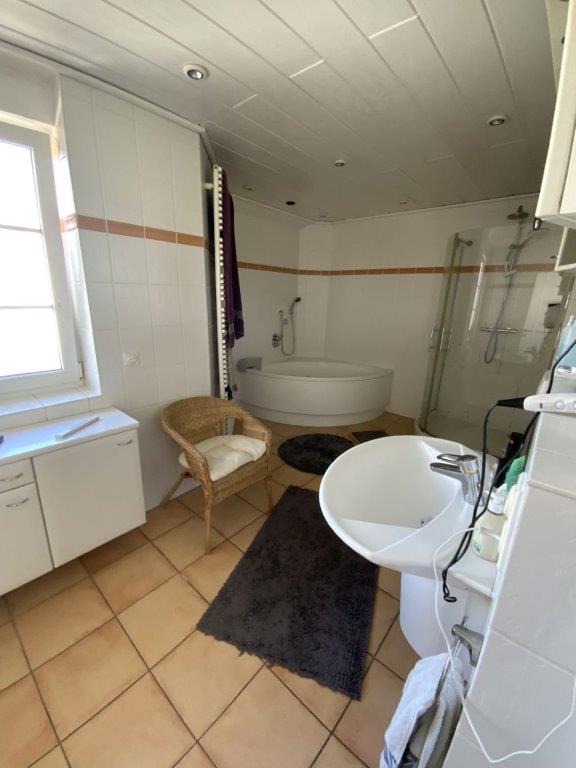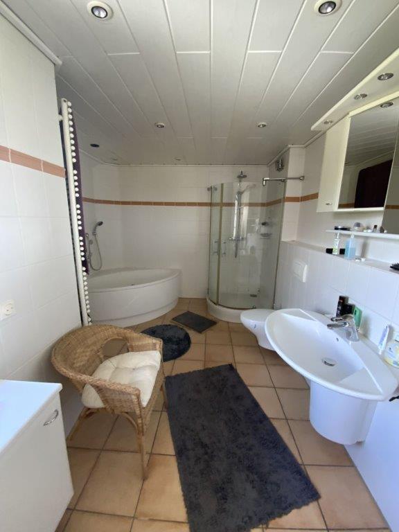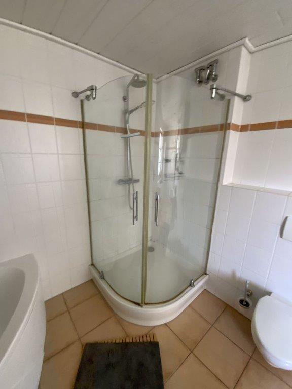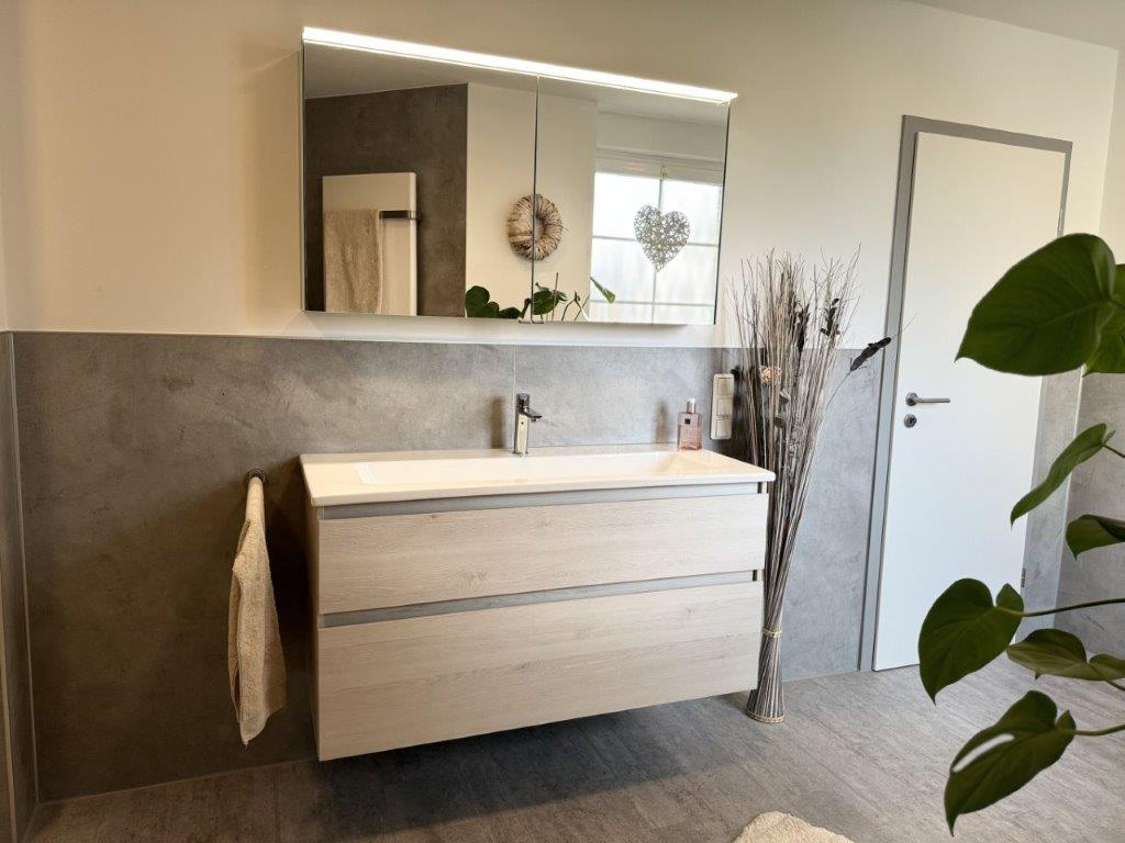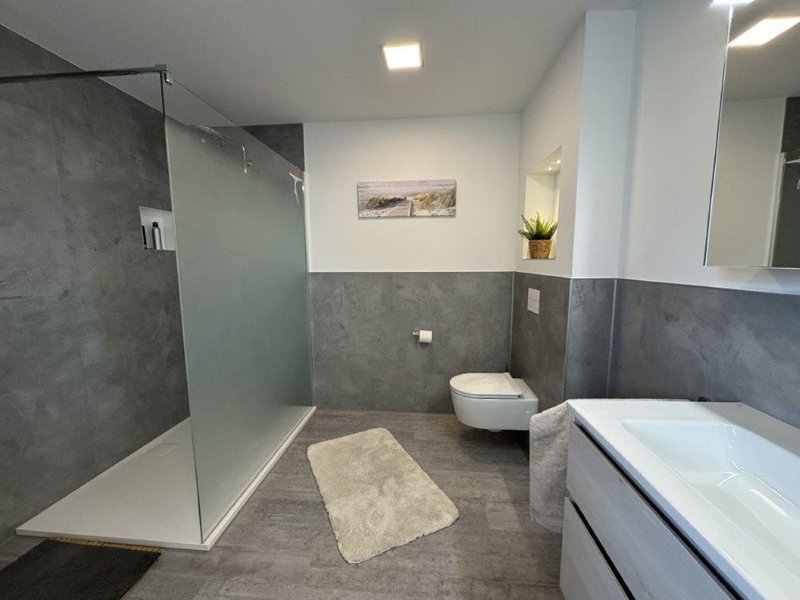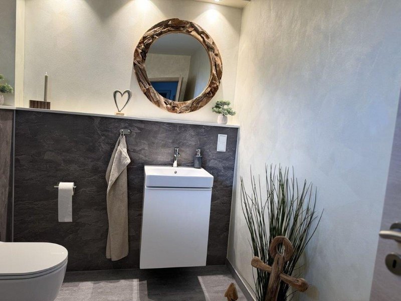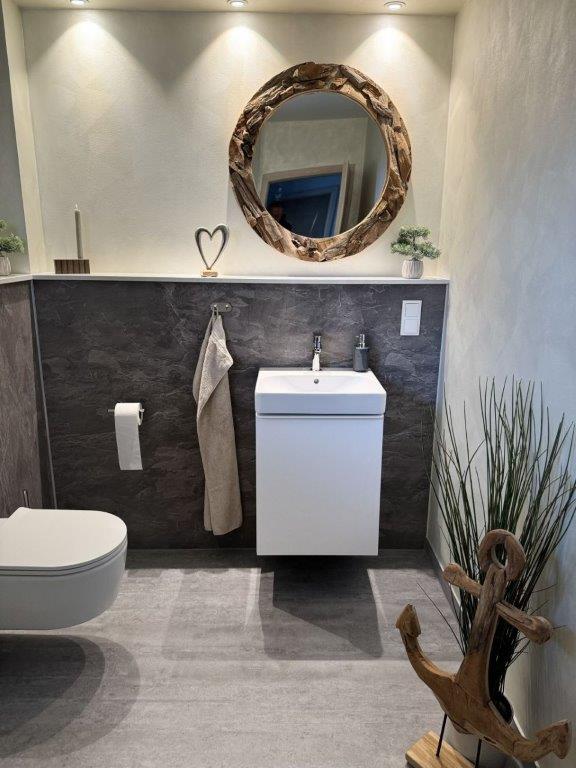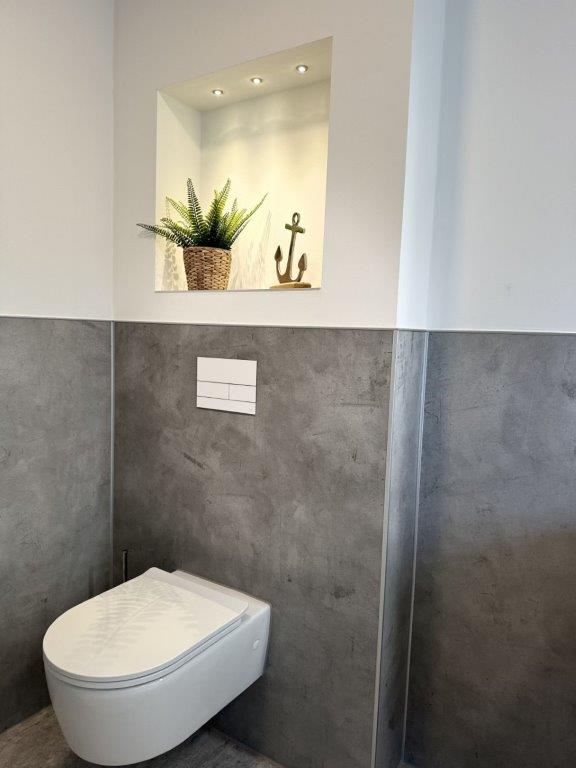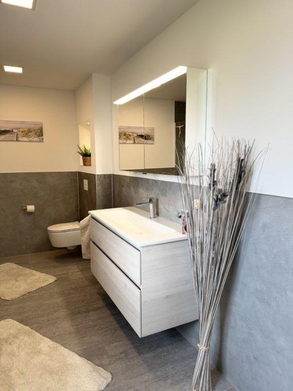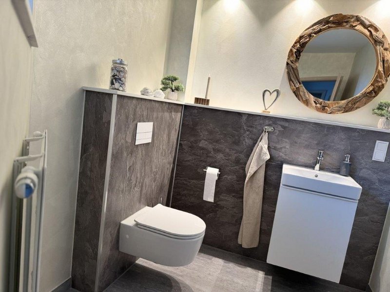 Die ungenutzte Eckbadewanne wich einer großzügigen, begehbaren Dusche – genau nach den Wünschen unserer Kunden. Ein großer Waschtisch mit viel Stauraum sorgt nun für Funktionalität und ein aufgeräumtes Ambiente. Auch das Gäste-WC erstrahlt in neuem Glanz: Die bewährte Aufteilung blieb erhalten, wurde aber mit modernen Elementen aufgewertet. So entstand ein stilvoller, zeitgemäßer Look, der das Gesamtbild perfekt abrundet.